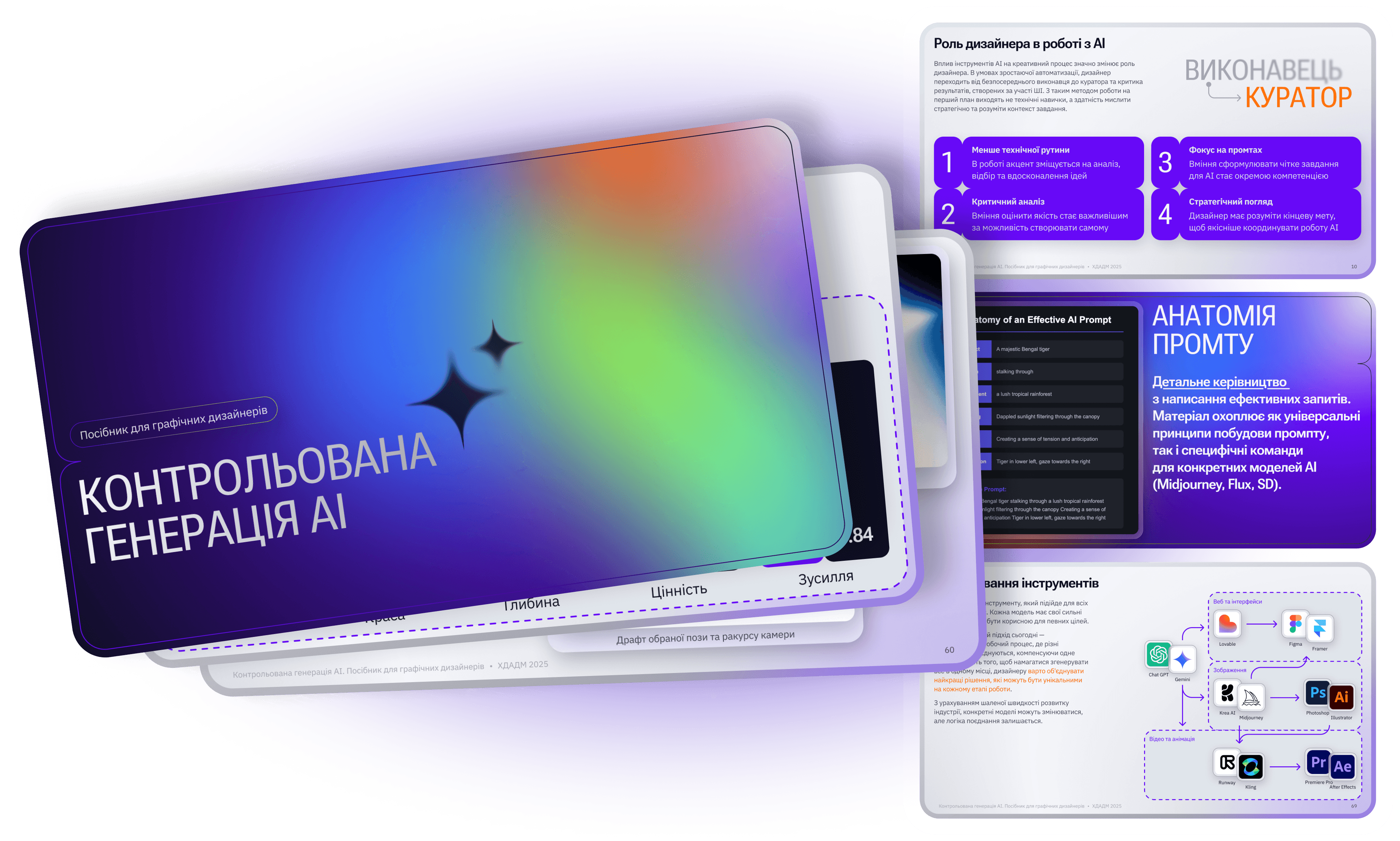 Дослідження та практичний гайд для графічних дизайнерів, які хочуть познайомитись з інструментами ШІ та розуміти як контролювати результат генерації. Посібник відповідає на актуальні правові та етичні питання, а також насичений як авторськими, так і світовими практичними прикладами для побудови ефективного робочого процесу.