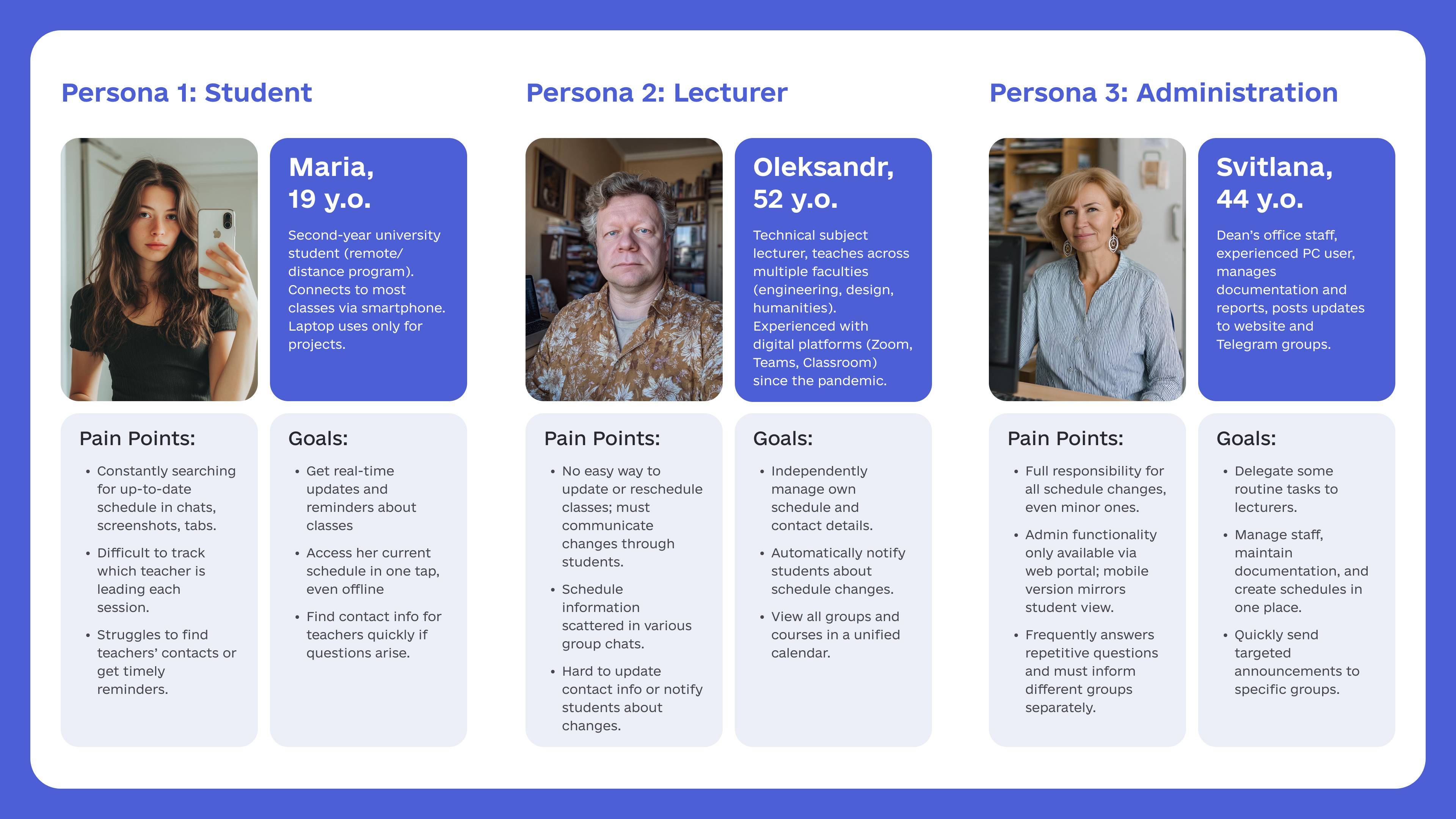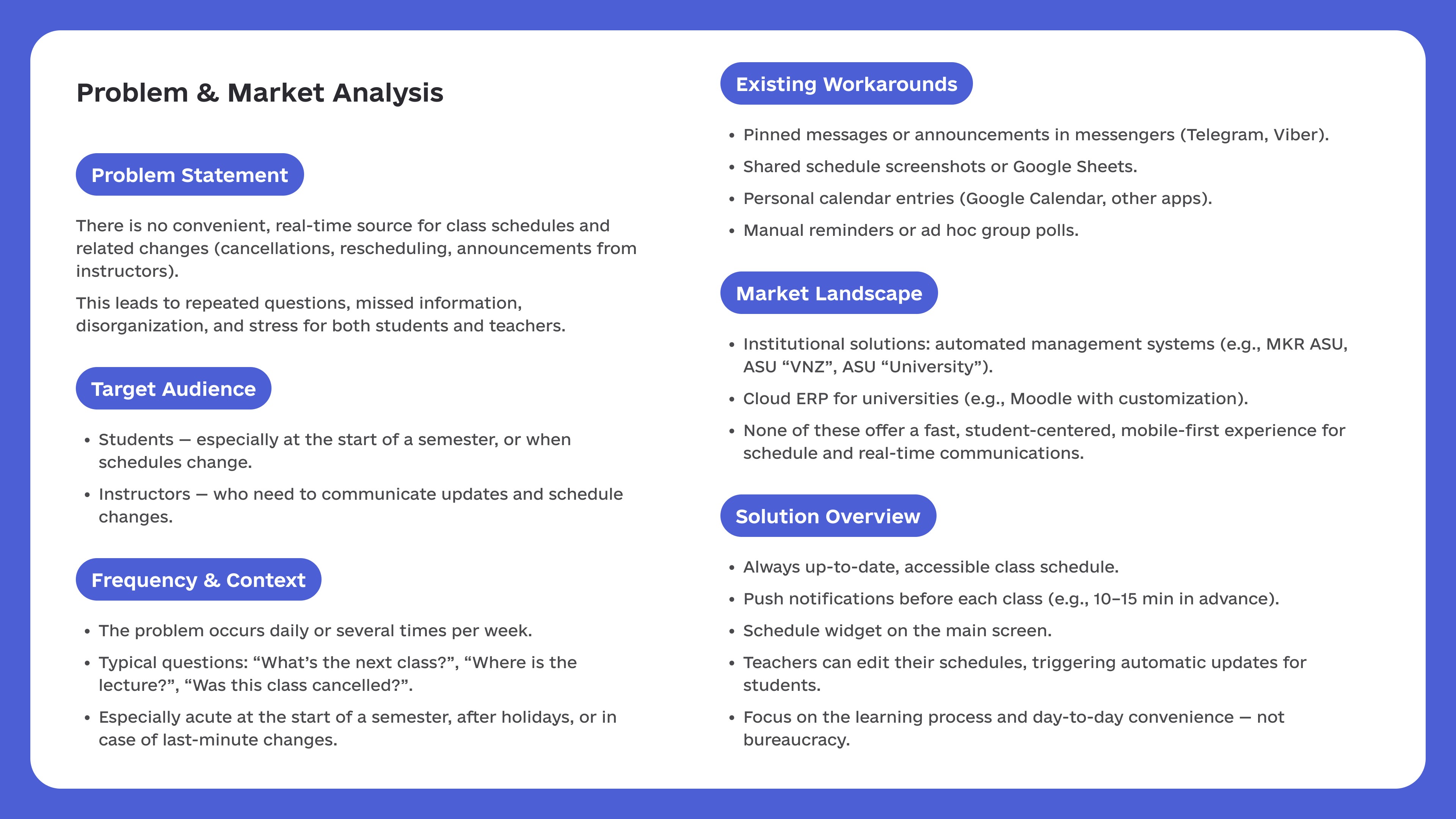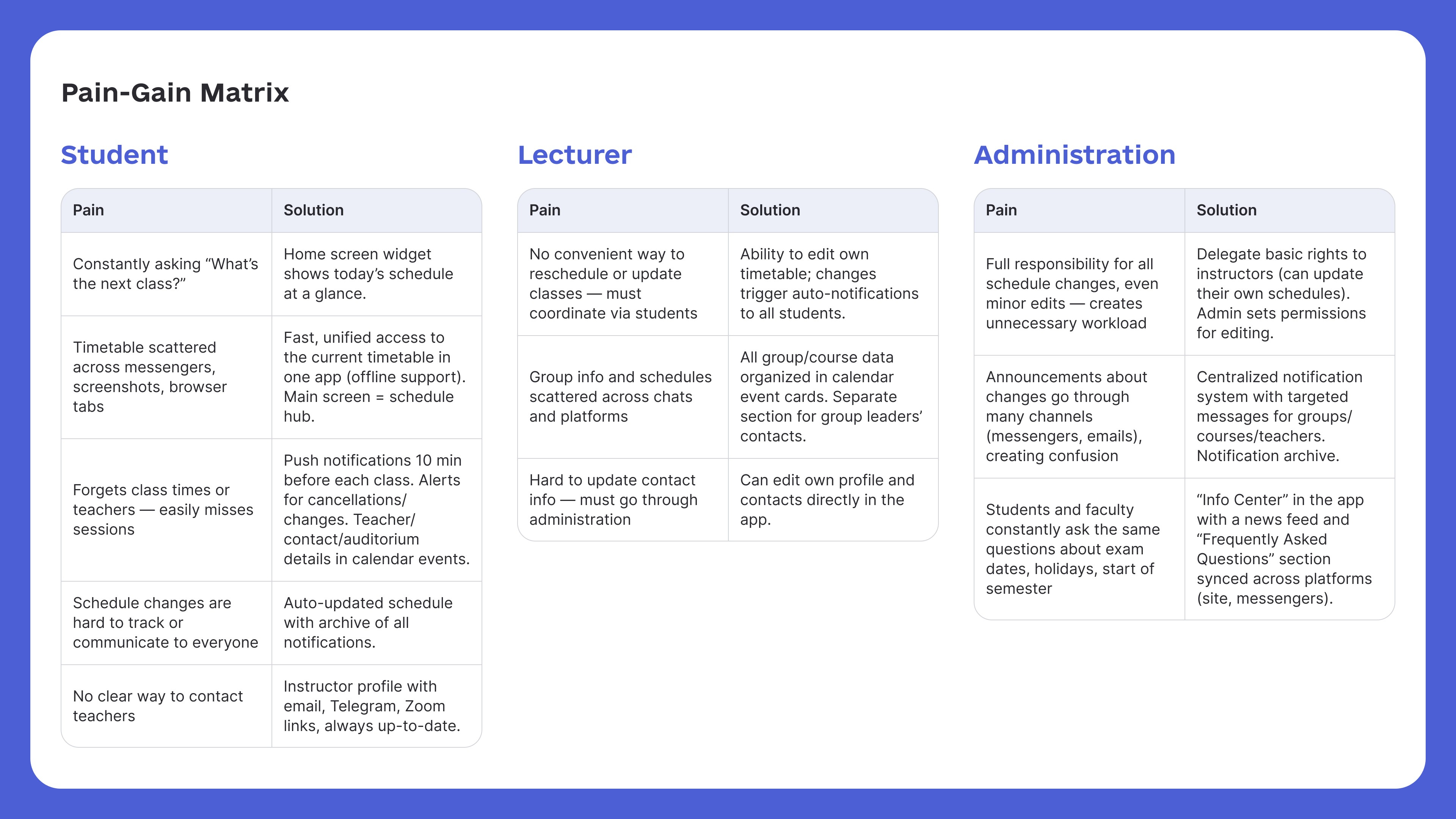 The prototype effectively covers students’ core needs: up-to-date schedules, instant notifications about changes, quick access to faculty contacts, and campus news.